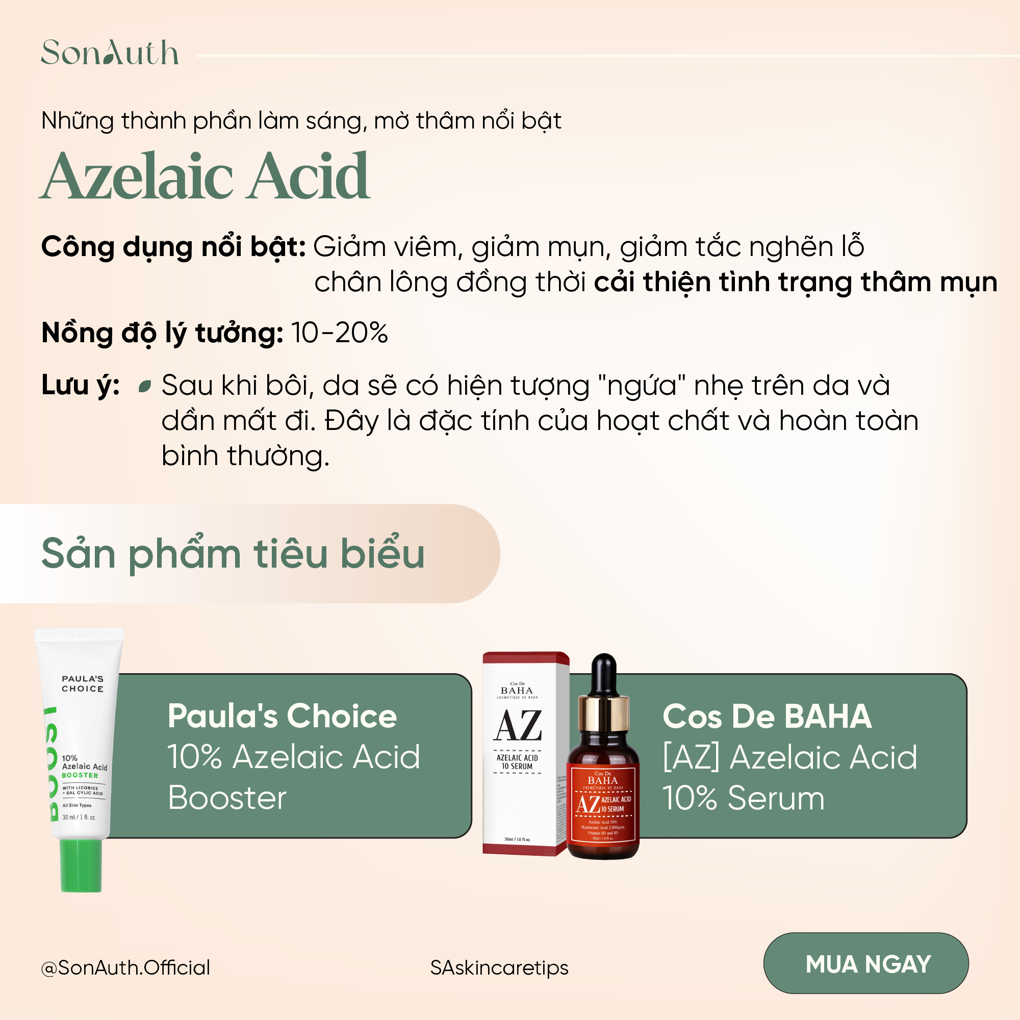 Azelaic Acid có các đặc tính kháng khuẩn và chống viêm hiệu quả, được sử dụng trong các sản phẩm trị mụn với cơ chế giảm lượng vi khuẩn gây mụn trên da và giúp lỗ chân lông của bạn thông thoáng. Ngoài ra em này còn có tác dụng ngăn ngừa quá trình sừng hóa, giảm tình trạng tích tụ tế bào da chết, giúp da láng mịn sáng khỏe. Đồng thời làm mờ thâm, giúp đều màu da hiệu quả.
