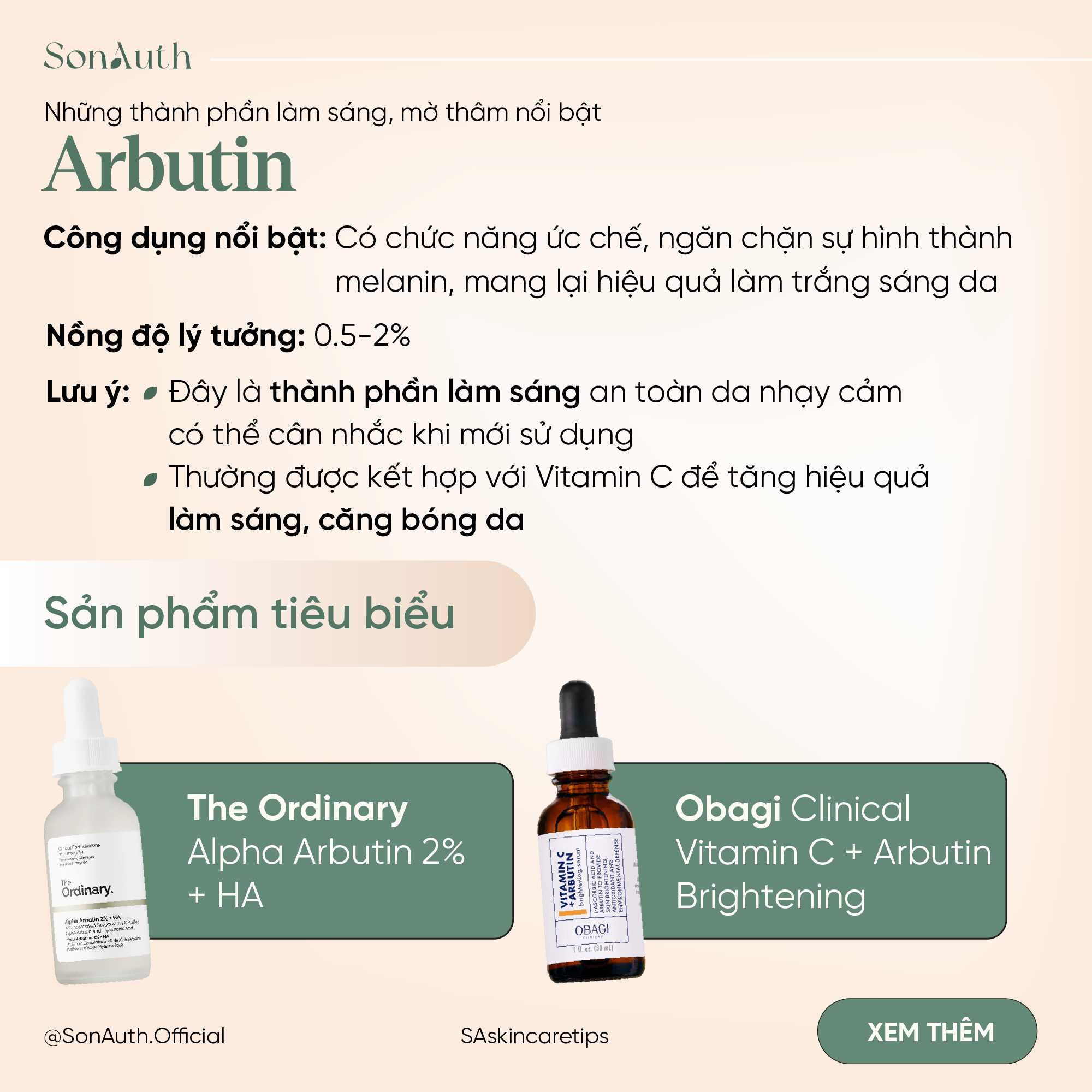 Hoạt chất làm trắng da an toàn và lành tính không bao giờ lỗi mốt, nó ức chế sự phát triển của Melanin, giúp làn da cải thiện độ trắng sáng. Arbutin (α- và β-arbutin) được sử dụng nhiều trong các sản phẩm làm đẹp.