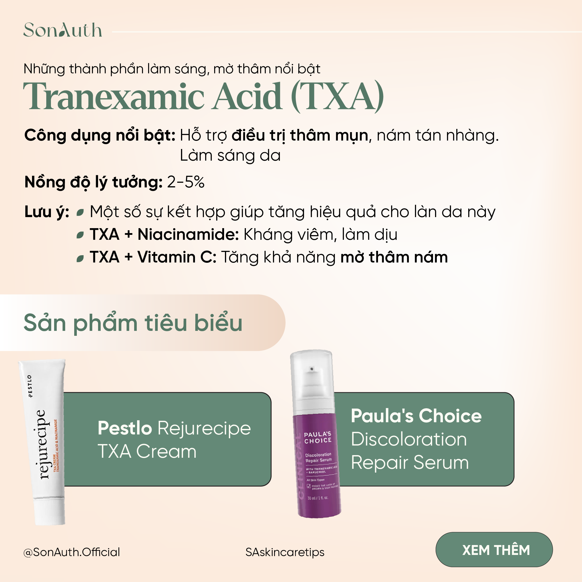 "Gương mặt triển vọng" với khả năng làm sáng tuyệt vời. Đây là một dẫn xuất tổng hợp của acid amin lysine được đánh giá cao về khả năng làm sáng da và cải thiện những đốm nâu do hắc tế bào Melanin gây ra. Tranexamic Acid hoạt động bằng cách ức chế việc tổng hợp Melanin do tia UV gây ra, ngăn cản sự tương tác của các tế bào da với hắc sắc tố. Từ đó giảm sự tăng hắc sắc tố trên da và làm sáng đều màu.