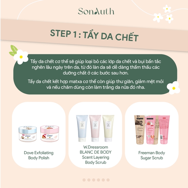 - Tẩy da chết cơ thể sẽ giúp loại bỏ các lớp da chết và bụi bẩn tắc nghẽn lâu ngày trên da, từ đó làn da sẽ dễ dàng thẩm thấu các dưỡng chất ở các bước sau hơn.