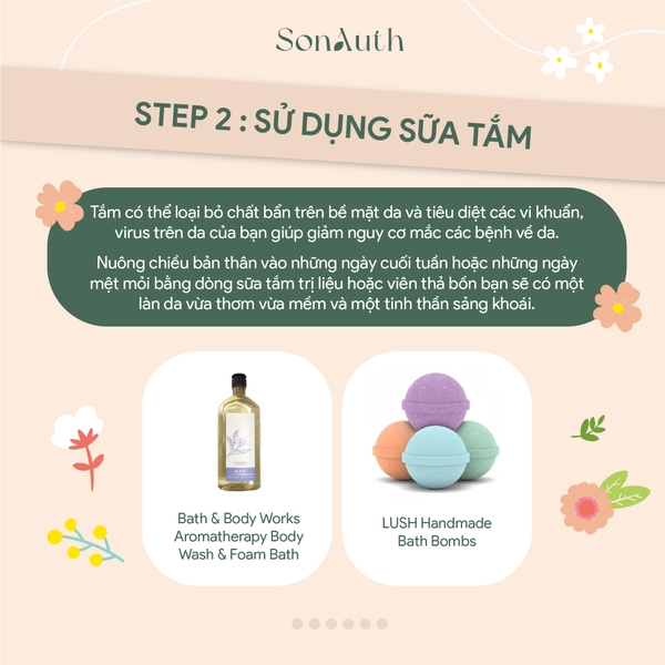 - Nuông chiều bản thân vào những ngày cuối tuần hoặc những ngày mệt mỏi bằng dòng sữa tắm trị liệu hoặc viên thả bồn bạn sẽ có một làn da vừa thơm vừa mềm và một tinh thần sảng khoái.