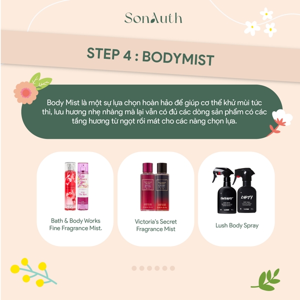 - Body Mist là một sự lựa chọn hoàn hảo để giúp cơ thể khử mùi tức thì, lưu hương nhẹ nhàng mà lại vẫn có đủ các dòng sản phẩm có các tầng hương từ ngọt rồi mát cho các nàng chọn lựa.