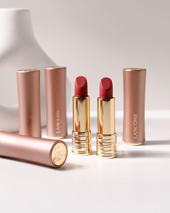 - Lancome L'absolu Rouge Intimatte là dòng son môi mịn lì, nhẹ và thoải mái, dễ dàng lên màu chỉ sau 1 lần lướt nhẹ trên môi, giúp chăm sóc cho đôi môi thoải mái, mang lại cảm giác nhẹ như nhung. Được gói gọn trong một chiếc hộp sang trọng vàng hồng cao cấp được sản xuất tại Pháp, để lộ đường cong nhỏ nhắn đặc trưng của L'Absolu Rouge, thân son chạm khắc vàng tinh tế.