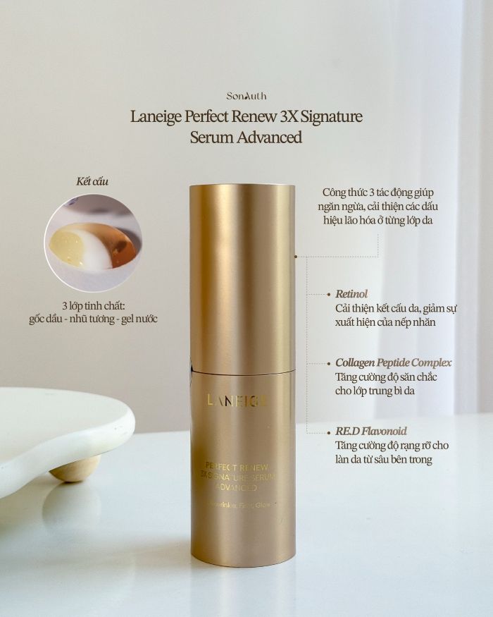 - Laneige Perfect Renew 3X Signature Serum Advanced là tinh chất dưỡng ẩm, cải thiện da lão hoá và dưỡng da căng mịn với công thức cải tiến 3 trong 1