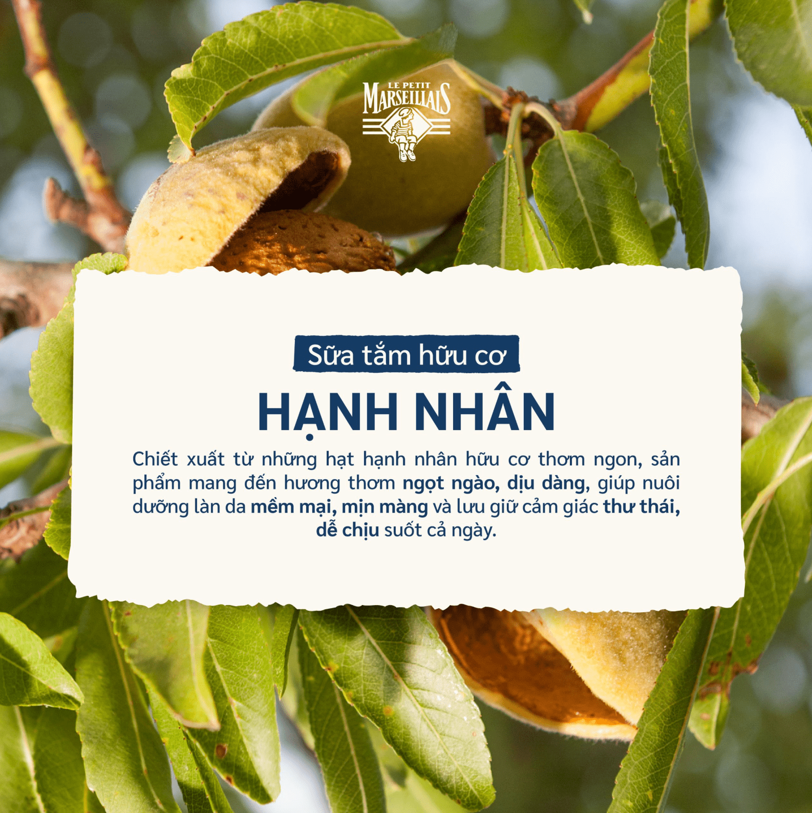 – Chiết xuất hạnh nhân hữu cơ: Giàu vitamin E và chất chống oxy hóa, giúp nuôi dưỡng, làm mềm da và chống lão hóa.