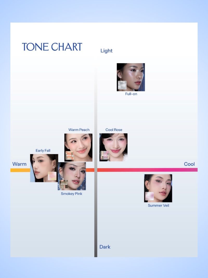 - Hệ thống màu Easy Match độc quyền giúp layout của bạn luôn tone-sur-tone, hài hòa với các gam màu Mắt - Má - Khối được phối sẵn ở mỗi bảng
