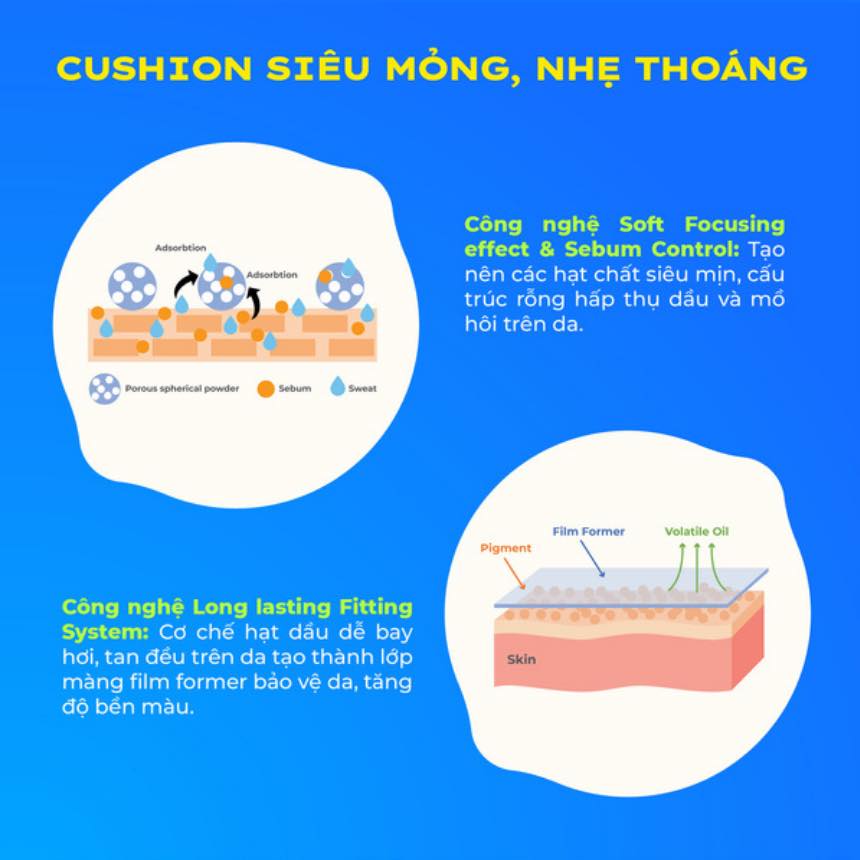 - Cushion sẽ tạo hiệu ứng ráo lì, mỏng nhẹ tự nhiên như da thật, nên sẽ có độ che phủ vừa đủ nhưng vẫn có độ kiềm dầu cao đến 10 tiếng