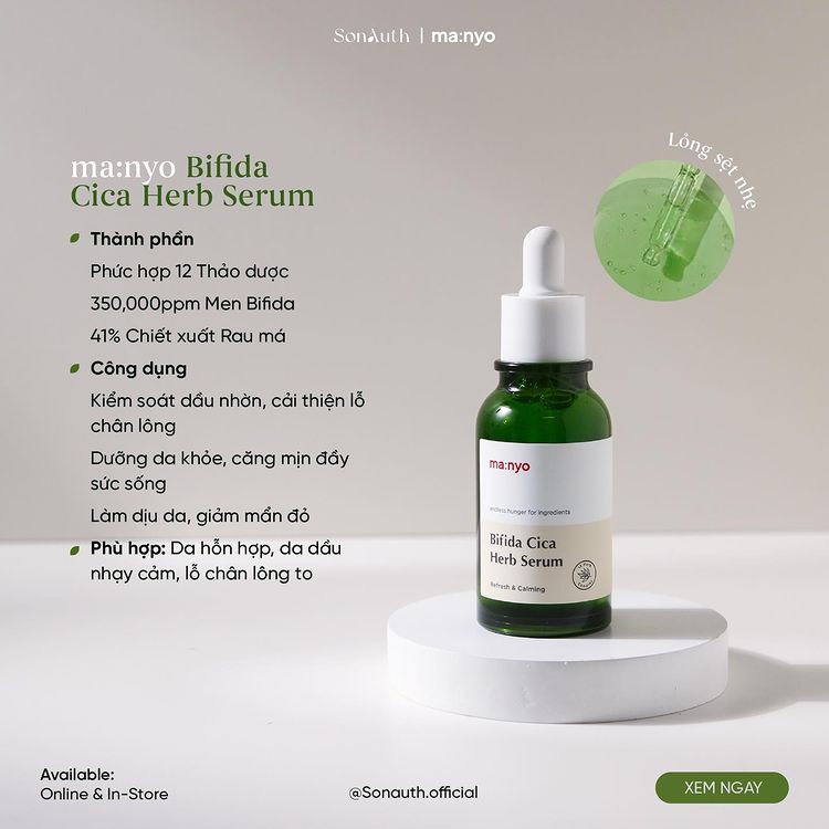 - Ma:nyo Bifida Cica Herb Serum là dòng tinh chất có bảng thành phần giàu các hoạt chất giải quyết các vấn đề thường gặp của làn da dầu, nhạy cảm