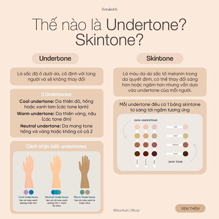 🎀 Skintone (tông da) là màu sắc của làn da mà chúng mình có thể dễ dàng nhận biết bằng mắt thường. Skintone có thể thay đổi theo thời gian, theo mùa và theo chế độ chăm sóc da. Ví dụ như mùa hè, cậu tiếp xúc với ánh nắng nhiều màu da có thể tối màu hơn.. Hoặc có thể nhờ sự chăm sóc da đúng cách, dưỡng sáng hiệu quả mà da cậu sẽ bật tone hơn. Như vậy với 1 loại undertone thì có rất nhiều skintone khác nhau, trải dài từ tone sáng đến tone ngăm.