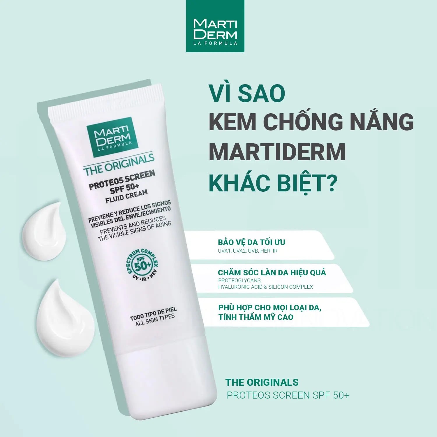 - Phức hợp độc quyền Proteos: Proteoglycans độc quyền từ MartiDerm, một loại protein được Gycosyl hoá, tồn tại sẵn có trong cơ thể con người (chủ yếu trong mô liên kết, tổ chức dưới da và tổ chức sụn khớp). Trên da, Proteoglycans tồn tại chủ yếu trong lớp hạ bì. Proteoglycans mang lại nhiều công dụng hữu ích cho làn da như