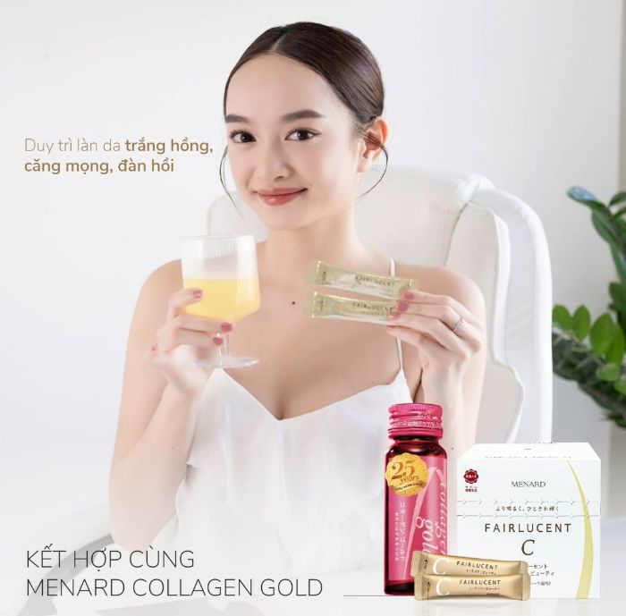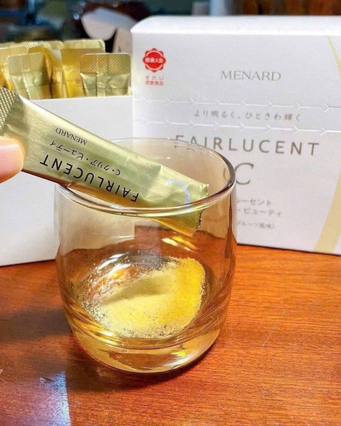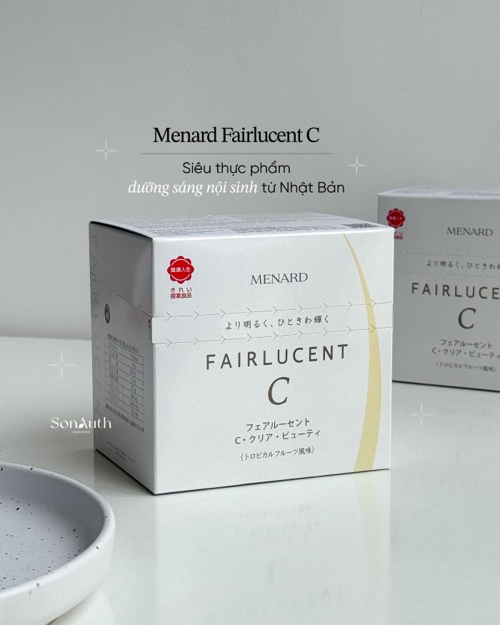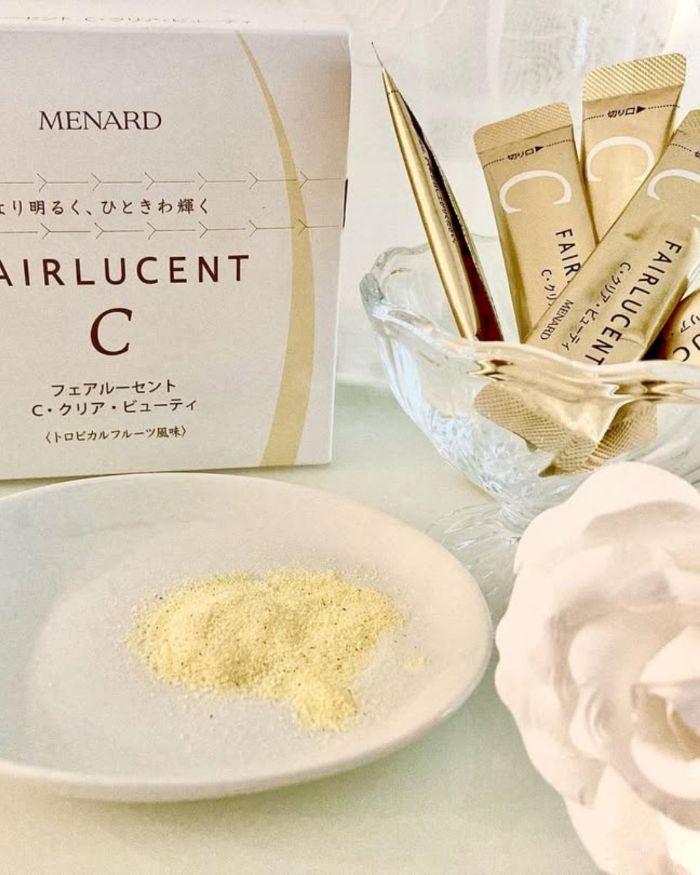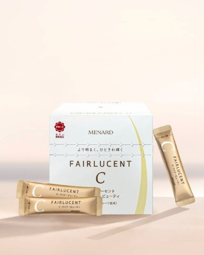 - Menard Fairlucent C là sản phẩm bột uống đem đến hiệu quả làm sáng từ bên trong, làm mờ sạm nám, chống nắng toàn thân nhanh, an toàn
