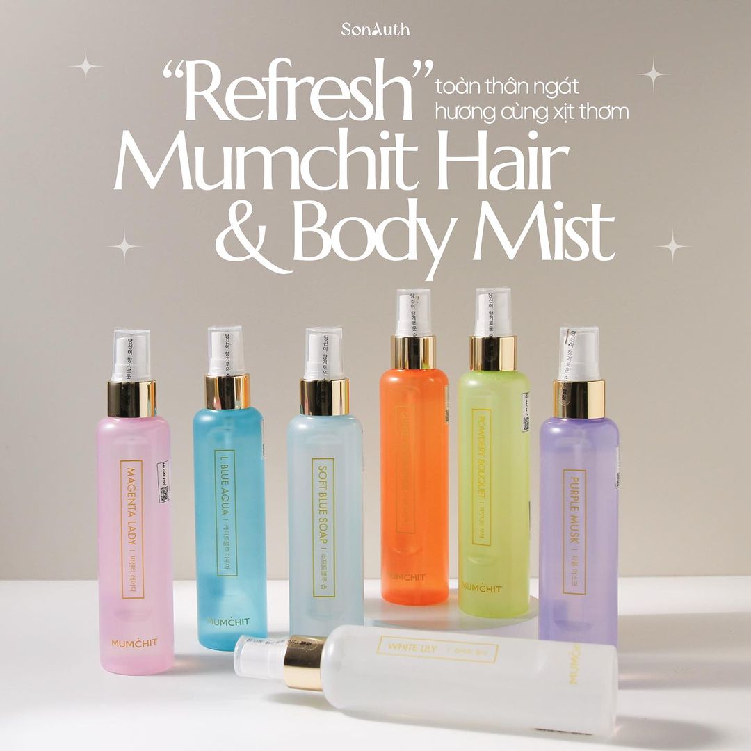 Mumchit Hair & Body Mist là dòng xịt thơm đa nhiệm cho cả tóc và cơ thể. Sản phẩm rất tiện lợi khi mang theo để mỗi khi bạn xuất hiện luôn có hương thơm nhẹ nhàng quanh quẩn bên mình.