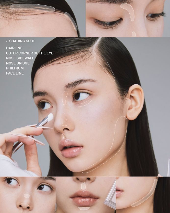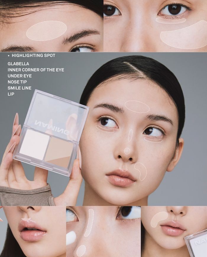 Màu sáng: Lấy 1 lượng sản phẩm vừa đủ, tán đều lên các vùng da cần bắt sáng như xương lông mày, sống mũi, đầu mũi, gò má, nhân trung,..