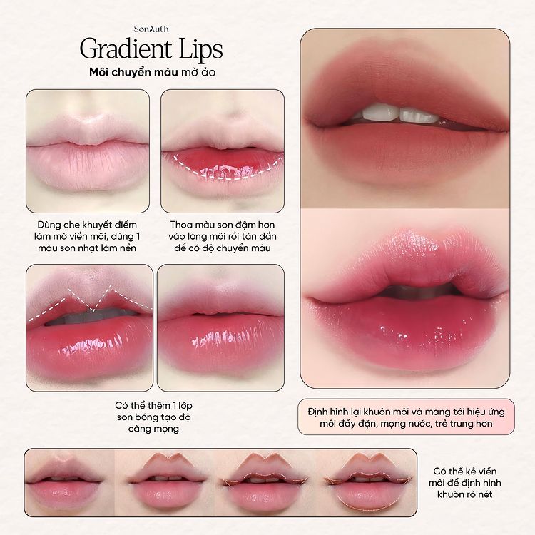 🎀 Môi chuyển màu, đơn giản là đôi môi có vùng đậm nhạt trông sẽ căng mọng, đầy đặn và chuyên nghiệp hơn hẳn, sử dụng cả với son lì và son bóng. Cậu cũng có thể thêm bước định hình môi để môi có khuôn chúm chím, xinh hơn nhiều
