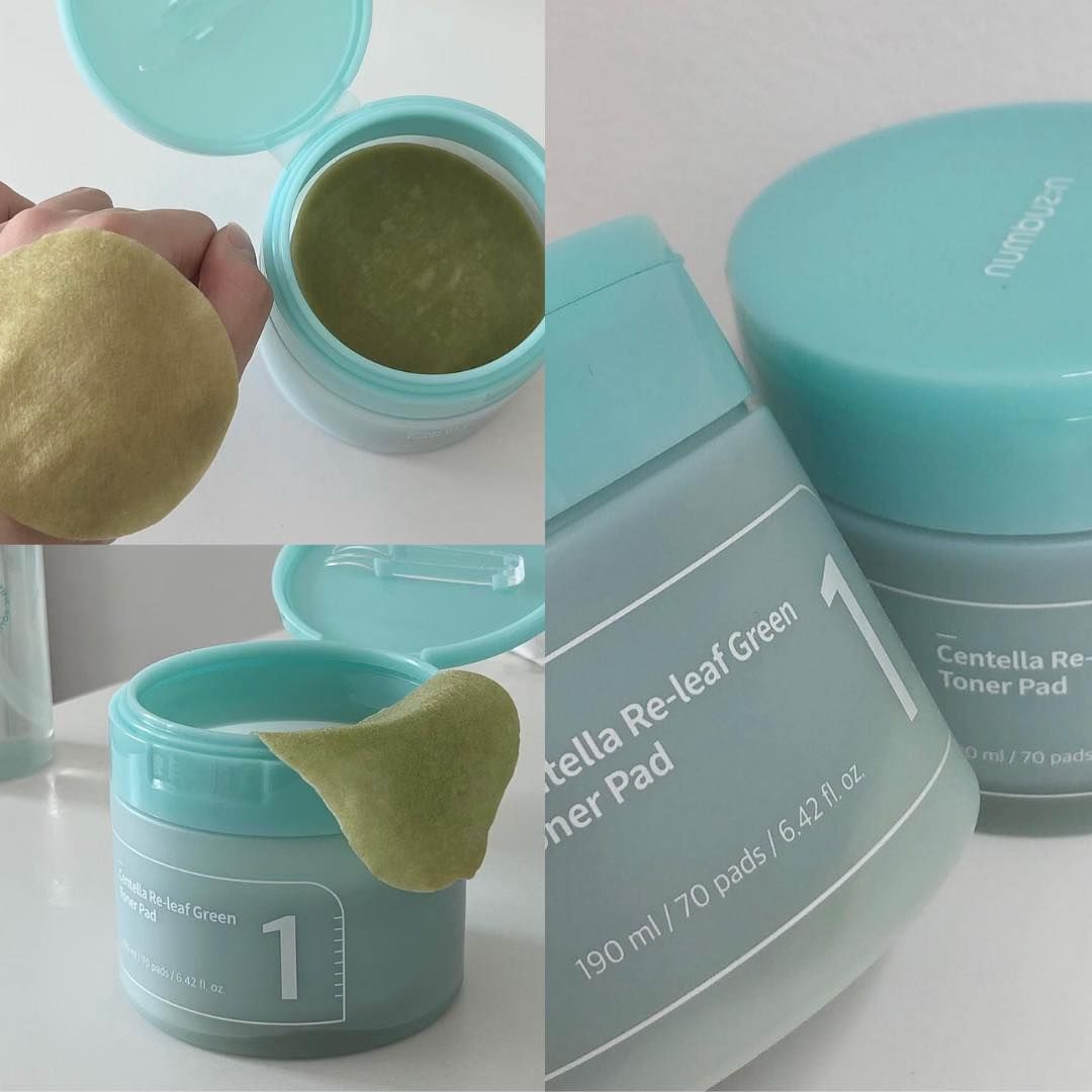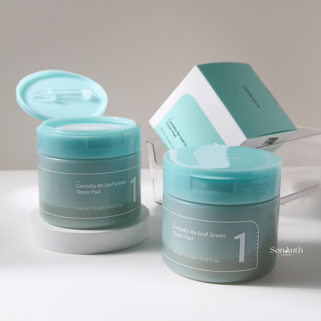 - Numbuzin No.1 Centella Re-Leaf Green Toner Pad là sản phẩm bông pad làm dịu, thành phần có đến 89% chiết xuất thảo dược giúp làm dịu các nốt mụn đỏ và vùng da có mụn, nhạy cảm tức thì