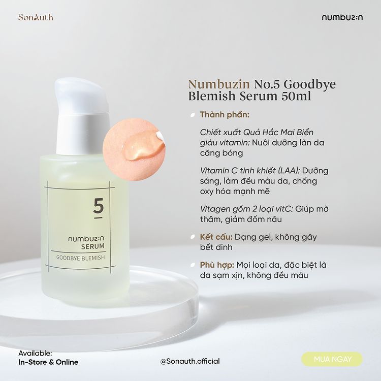 - Numbuzin No.5 Goodbye Blemish Serum là dòng serum cô đặc mang tới hiệu quả mạnh mẽ cho làn da không đều màu, có thâm mụn, mụn nhẹ được yêu thích