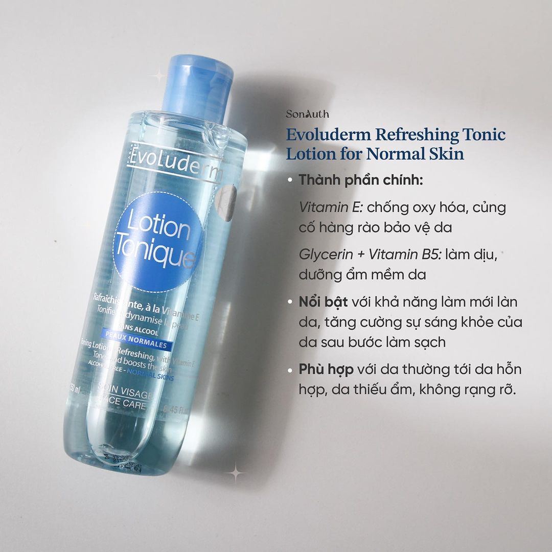 - Evoluderm Refreshing Tonic Lotion Normal Skin là bước cân bằng da hiệu quả, lấy lại độ pH lý tưởng sau khi làm sạch da