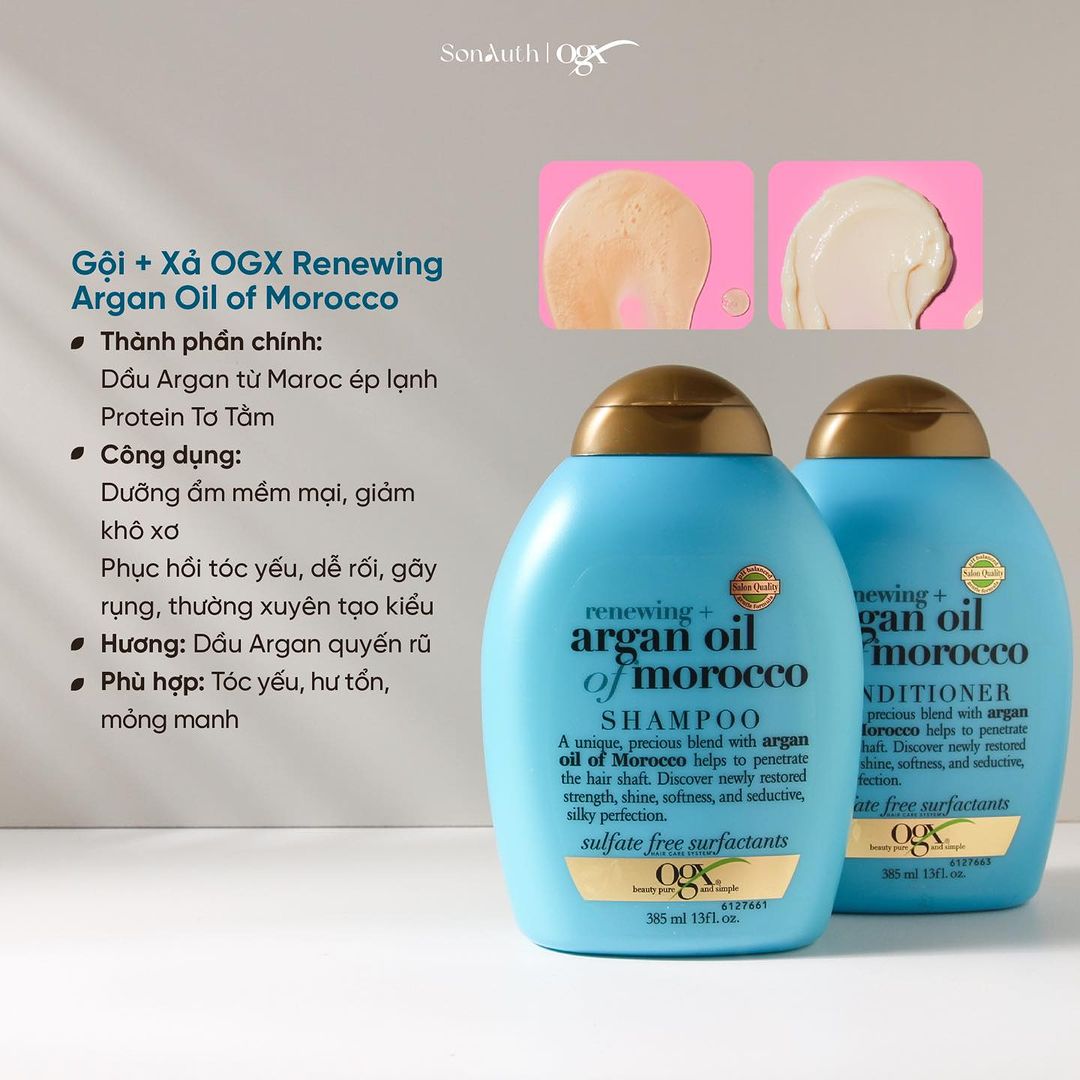 - OGX Renewing+Argan Oil Of Morocco là dòng dầu gội, xả có công dụng hydrat hóa, phục hồi và làm mới tóc khô, hư tổn, dễ gãy