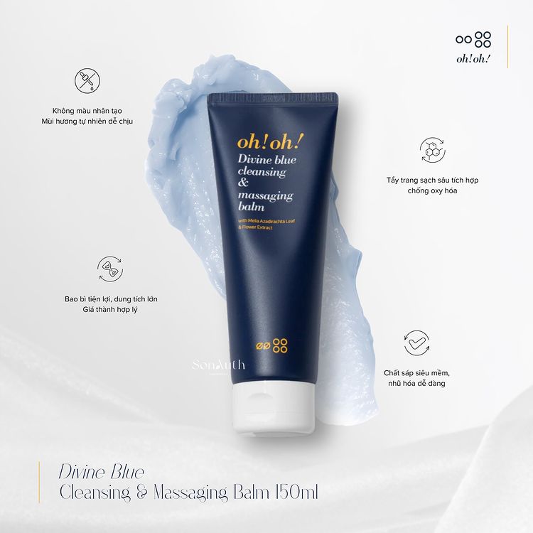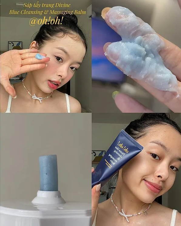 - Oh! Oh! Divine Blue Cleansing & Massaging Balm là sản phẩm tẩy trang dạng sáp giúp làm sạch bụi bẩn, dầu nhờn cho da mà không gây khô căng da
