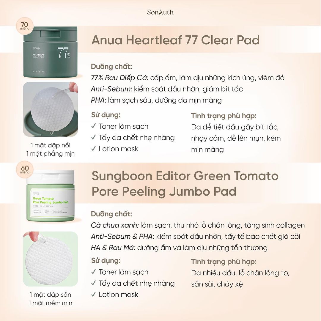 Bên cạnh đó, mỗi dòng pad còn giải quyết được nhiều vấn đề của da. Sử dụng được nhiều bước lại vô cùng tiết kiệm thời gian và sản phẩm. Cùng SonAuth tìm hiểu sâu những dòng pad đang có sẵn nha 🥰
