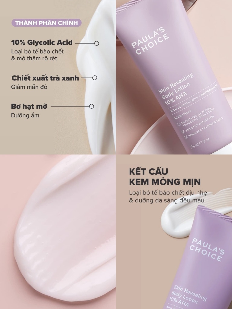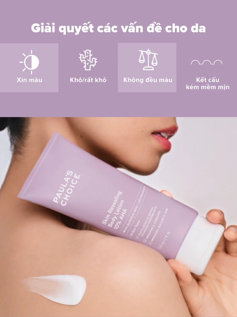 - Paula's Choice Resist Skin Revealing Body Lotion 10% AHA là kem dưỡng thể giúp làm sáng và đều màu da, mang đến giải pháp làm mịn - sáng - đều màu chỉ trong một bước đơn giản