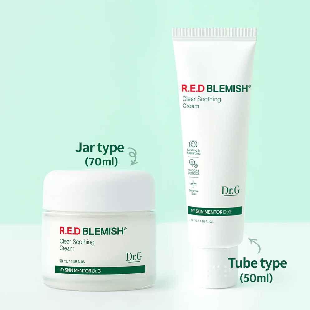 - Dr.G R.E.D Blemish Clear Soothing Cream dòng kem dưỡng gel-cream đình đám dành cho các bạn có làn da dầu, da mụn với bảng thành phần chứa các dưỡng chất Phức hợp 10-CICA từ rau má: phục hồi và làm dịu làn da đang bị kích ứng