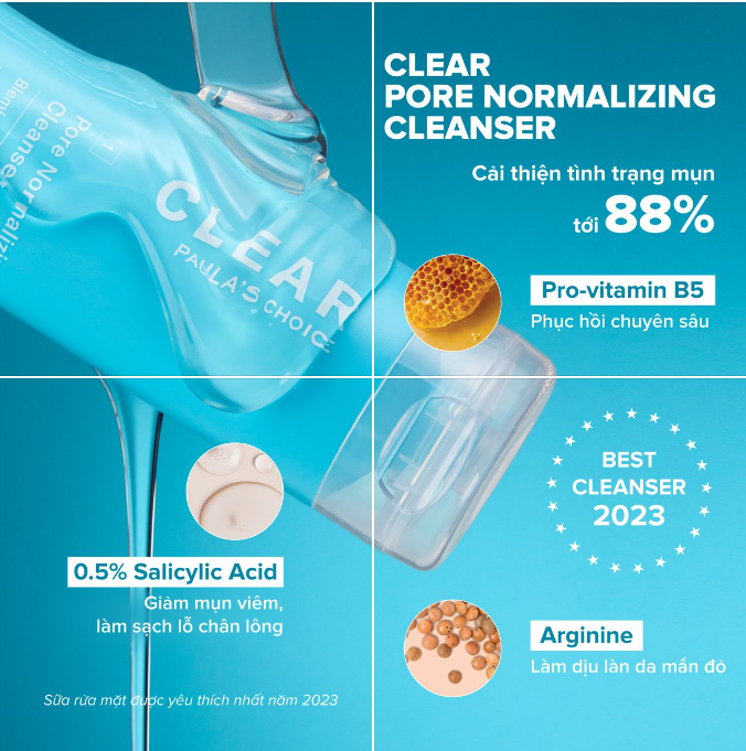 - Paula's Choice Clear Pore Normalizing Cleanser là gel rửa mặt dành cho da nhạy cảm, trở thành dòng sữa rửa mặt đươc yêu thích nhất năm 2023