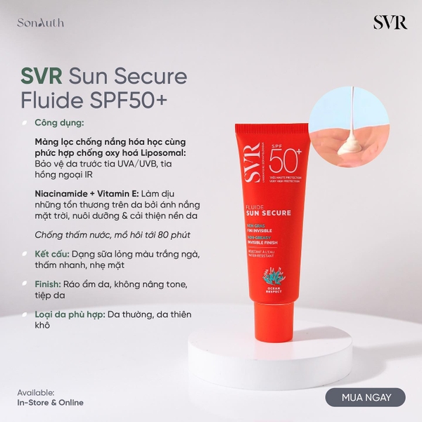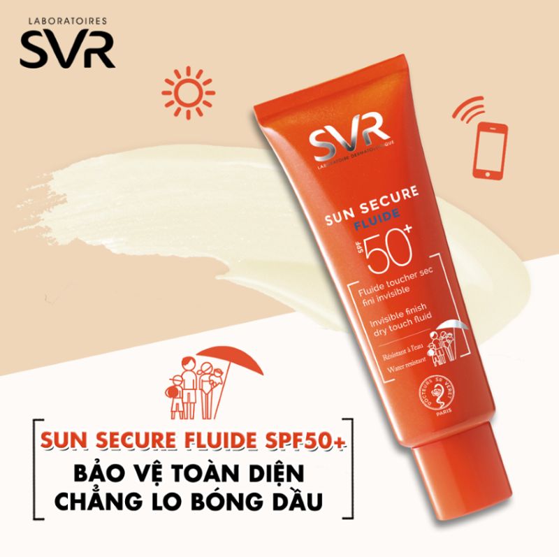 - SVR Fluide Sun Secure là kem chống nắng dành cho cả gia đình, sử dụng màng lọc UV thế hệ mới có khả năng phản chiếu, hấp thụ và chuyển hóa toàn bộ lượng tia UV chiếu vào da. Bảo vệ da khỏi nhiệt lượng từ ánh nắng mặt trời gay gắt ngăn chặn cháy nắng và bỏng rát da, bền vững suốt ngày dài mà ít bị quang hóa mất đi tác dụng. Chống lại cả những tia bức xạ dài như UVA1, loại bức xạ mà có thể đâm xuyên xuống tầng hạ bì khiến cho cấu trúc da bị tổn thương trầm trọng.