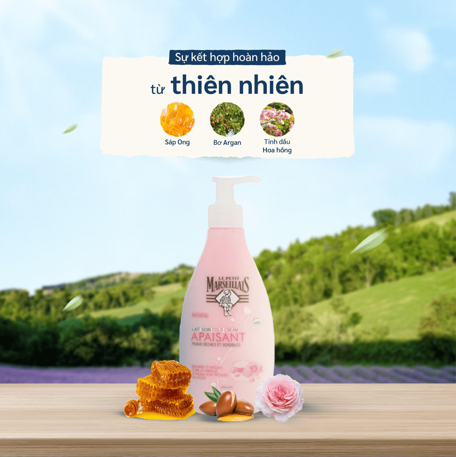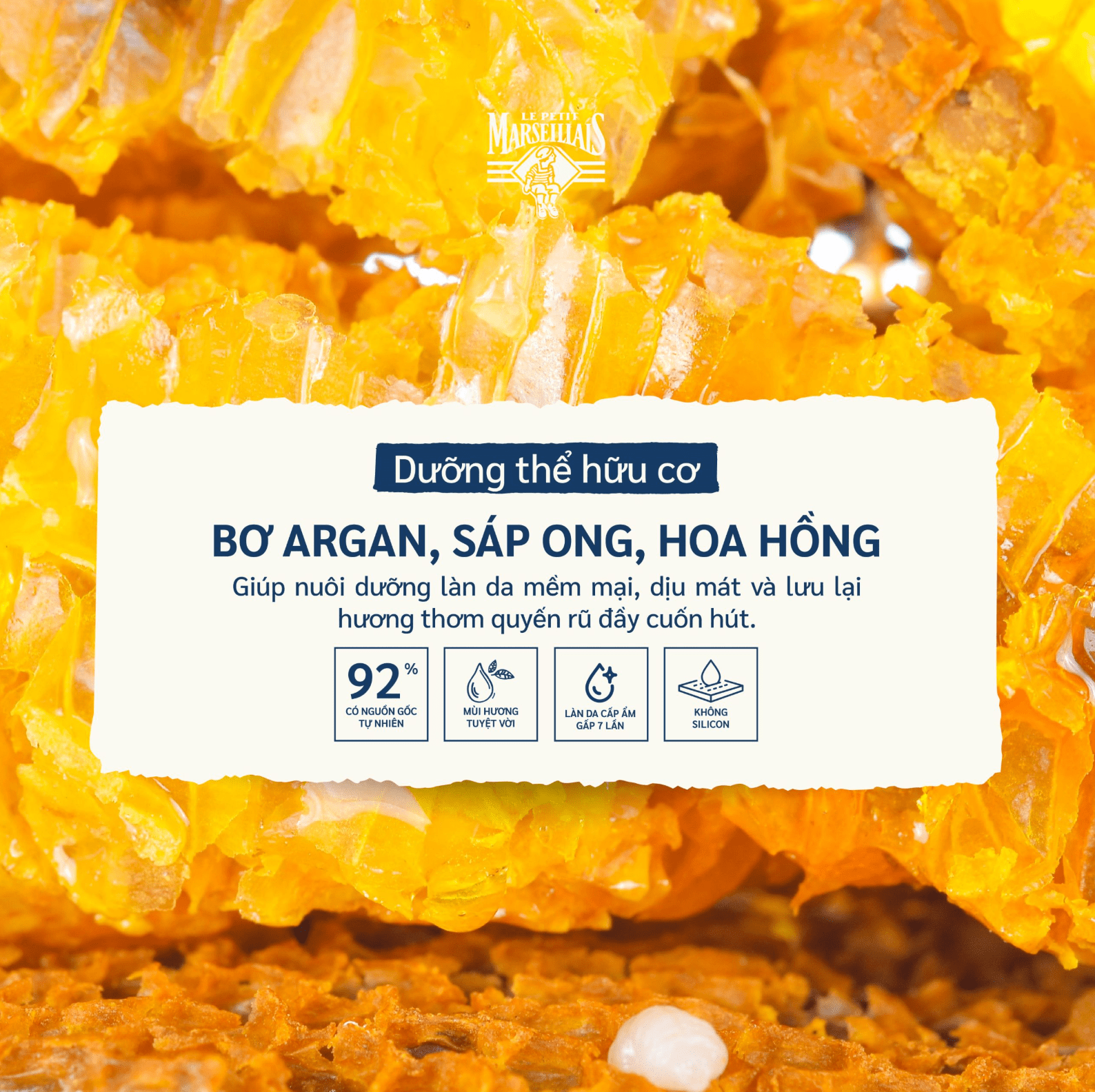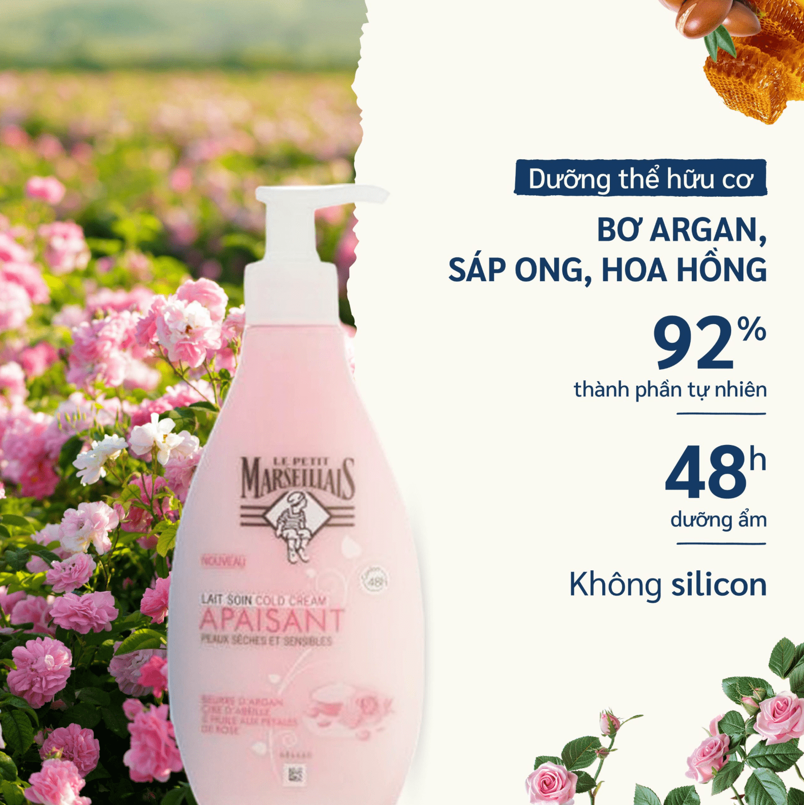 Argan,Cire & Rose - Sữa Dưỡng Thể Lạnh 48h Le Petit Marseillais Bơ Argan, Sáp Ong, Hoa Hồng
