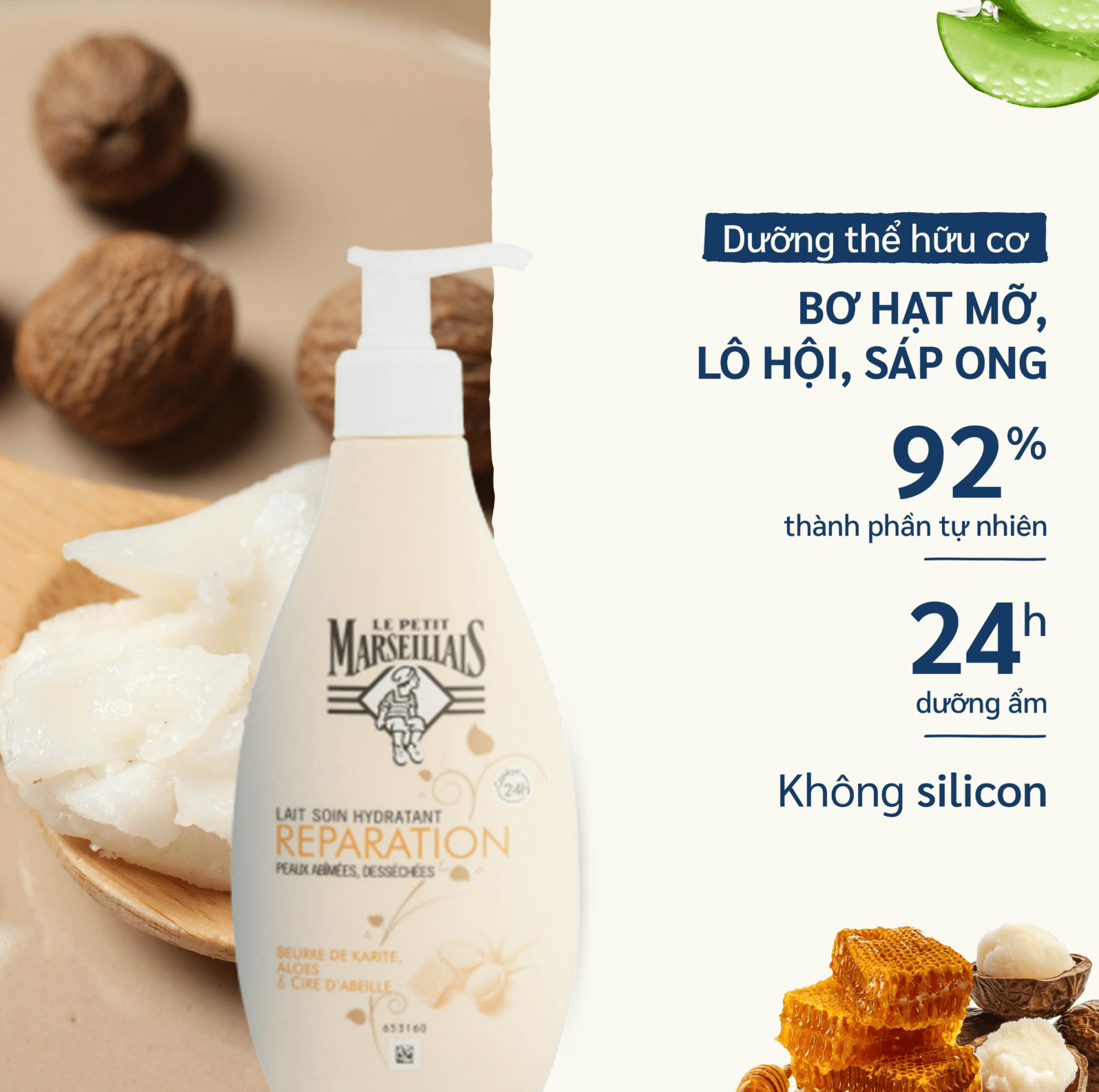 Karite, Aloes & Cire - Sữa Dưỡng Ẩm 24h Le Petit Marseillais Bơ Hạt Mỡ, Lô Hội & Sáp Ong