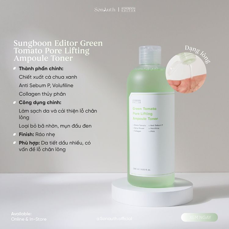 Sungboon Editor Green Tomato Pore Lifting Ampoule Toner với thành phần chiết xuất từ trái Cà chua xanh đã nằm dành được các giải thưởng Beauty, và đang nằm trong top toner bán chạy nhất, có điều gì thú vị ở chai toner này?