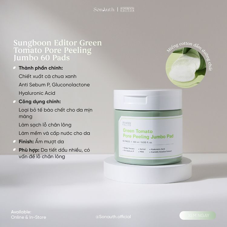Độ phủ sóng của SUNGBOON EDITOR đã về đến SonAuth, đặc biệt dòng sản phẩm chiết với xuất cà chua xanh thuộc top bán tại các bảng xếp hạng bên Hàn đã sẵn sàng trên kệ chúng mình rồi. Sungboon Editor Green Tomato Pore Peeling Jumbo 60 Pads sẽ mang lại cho làn da bạn những tác dụng tuyệt vời, bạn đã tìm hiểu chưa.