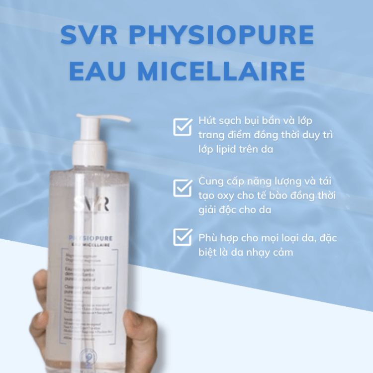 - Nước Tẩy Trang SVR Physiopure Eau Micellaire với công thức micellar mới giúp làm sạch hiệu quả và an toàn. Vô số các phần tử nhỏ Micelles với 2 cực: một cực ưa dầu có khả năng hòa tan bã nhờn cấu kết với lớp trang điểm chống trôi sâu bên trong lỗ chân lông, một cực ưa nước giúp cuốn trôi bụi bẩn