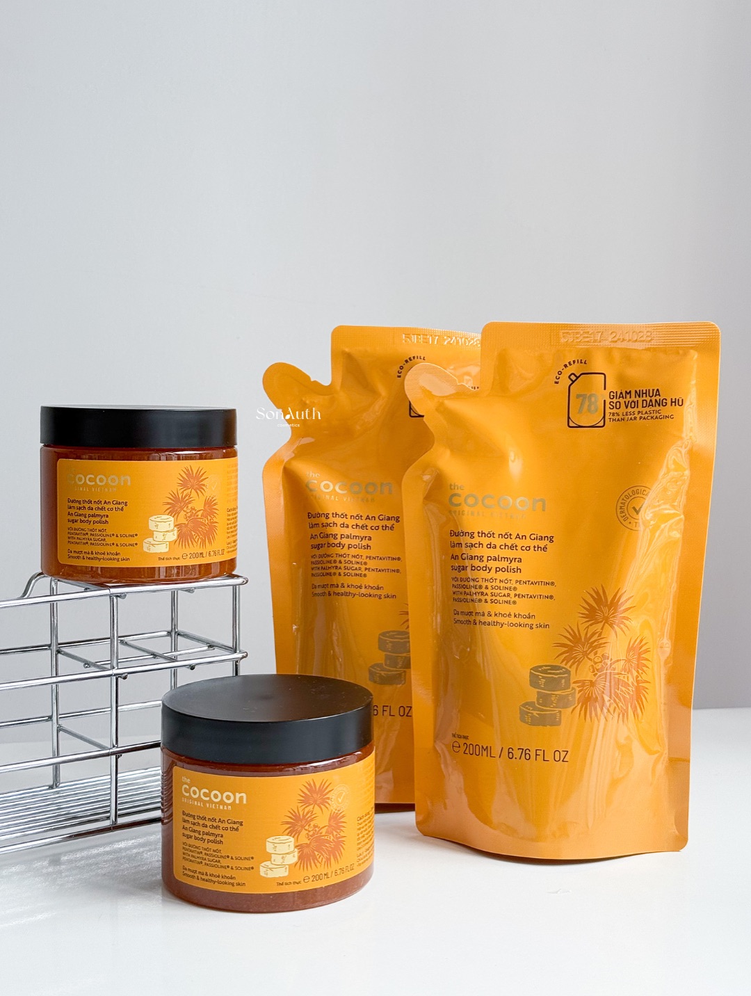 - Đường Thốt Nốt An Giang Cocoon tẩy tế bào da chết cơ thể gồm những tinh thể đường thốt nốt nhuyễn mịn kết hợp với các thành phần dưỡng ẩm giúp nhẹ nhàng cuốn trôi tế bào chết, mang lại làn da mượt mà, đồng thời dưỡng ẩm sâu và củng cố hàng rào tự nhiên của da