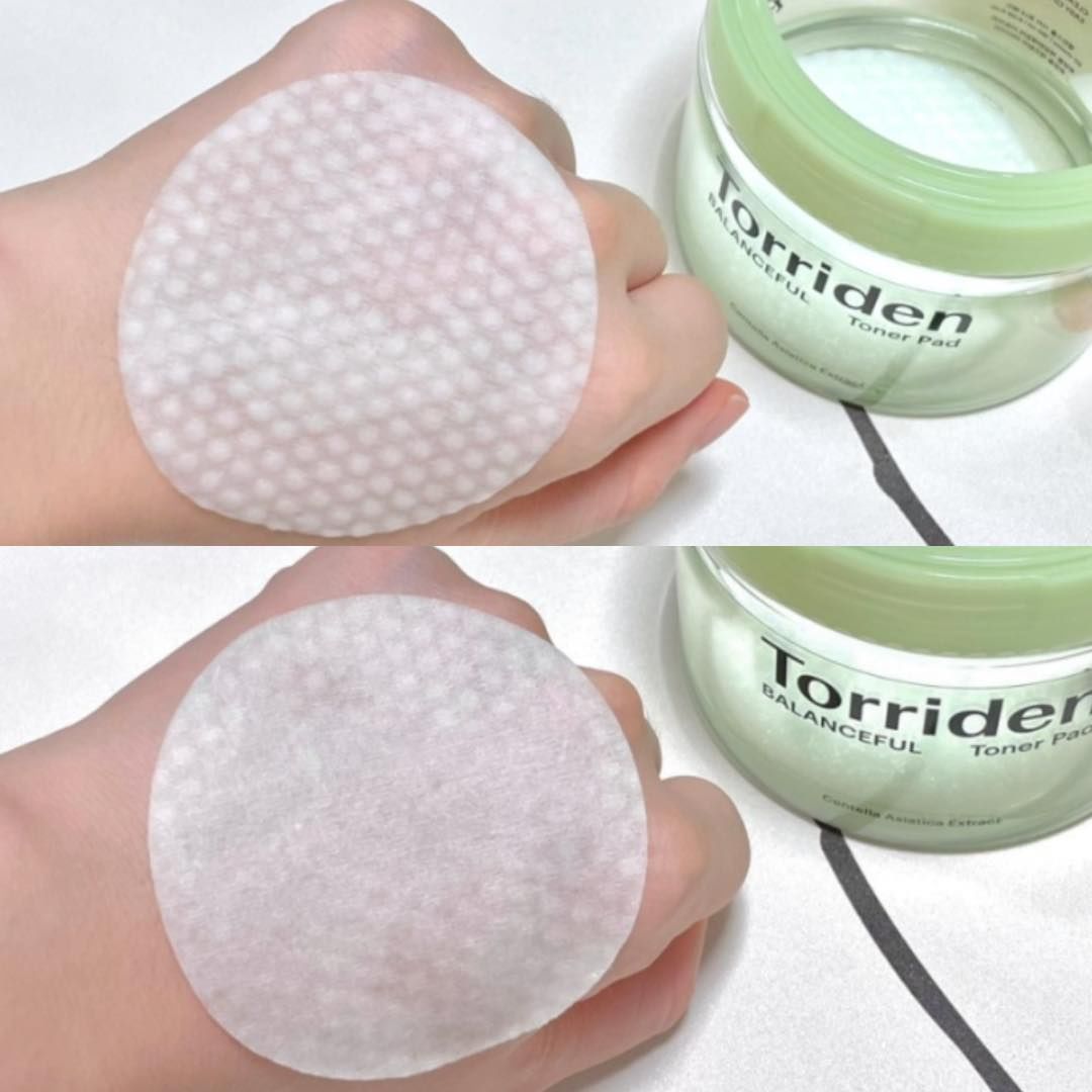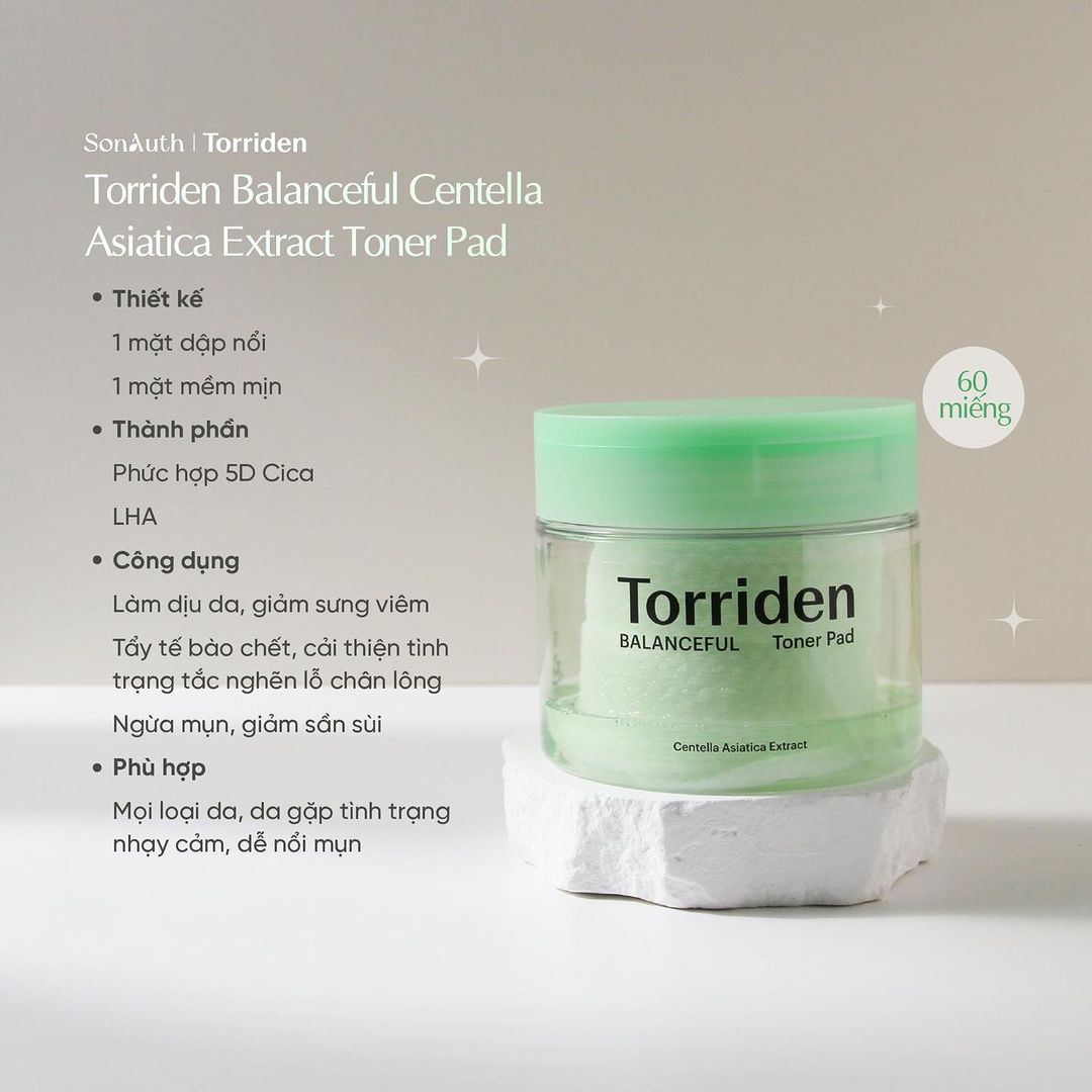 - Bông dưỡng da Torriden Balanceful Centella Asiatica Extract Toner Pad với thành phần chứa phức hợp 5D Cica với 5 dẫn xuất chiết xuất từ Rau Má, có khả năng làm dịu da, giảm các nốt đỏ, sưng viêm của mụn