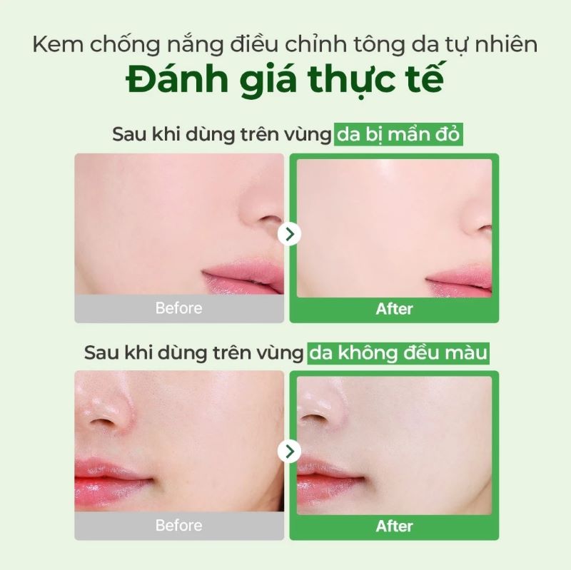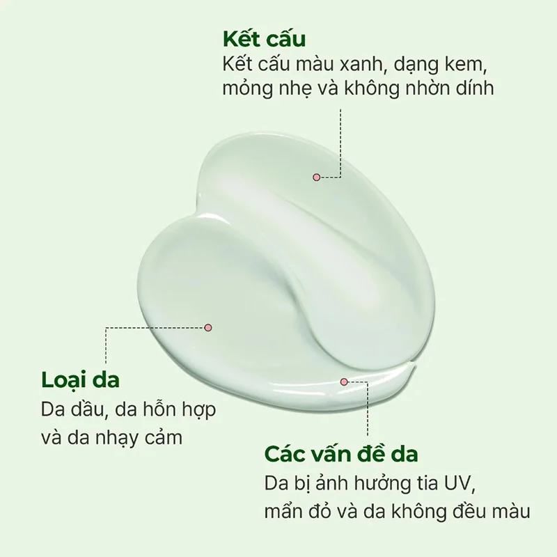 - Kem chống nắng hiệu chỉnh tone da Green-fit tự nhiên, giảm những vùng mẩn đỏ. Finish khô ráo, có khả năng chống nước, mồ hôi.