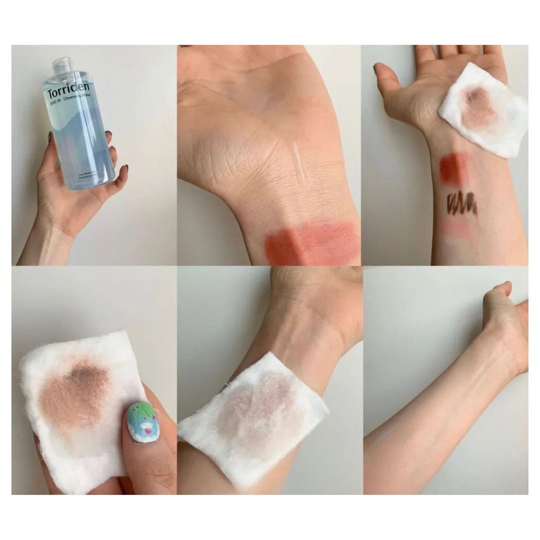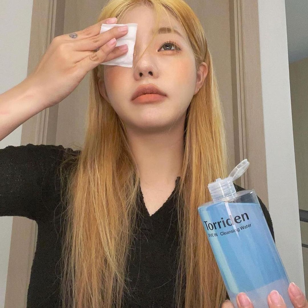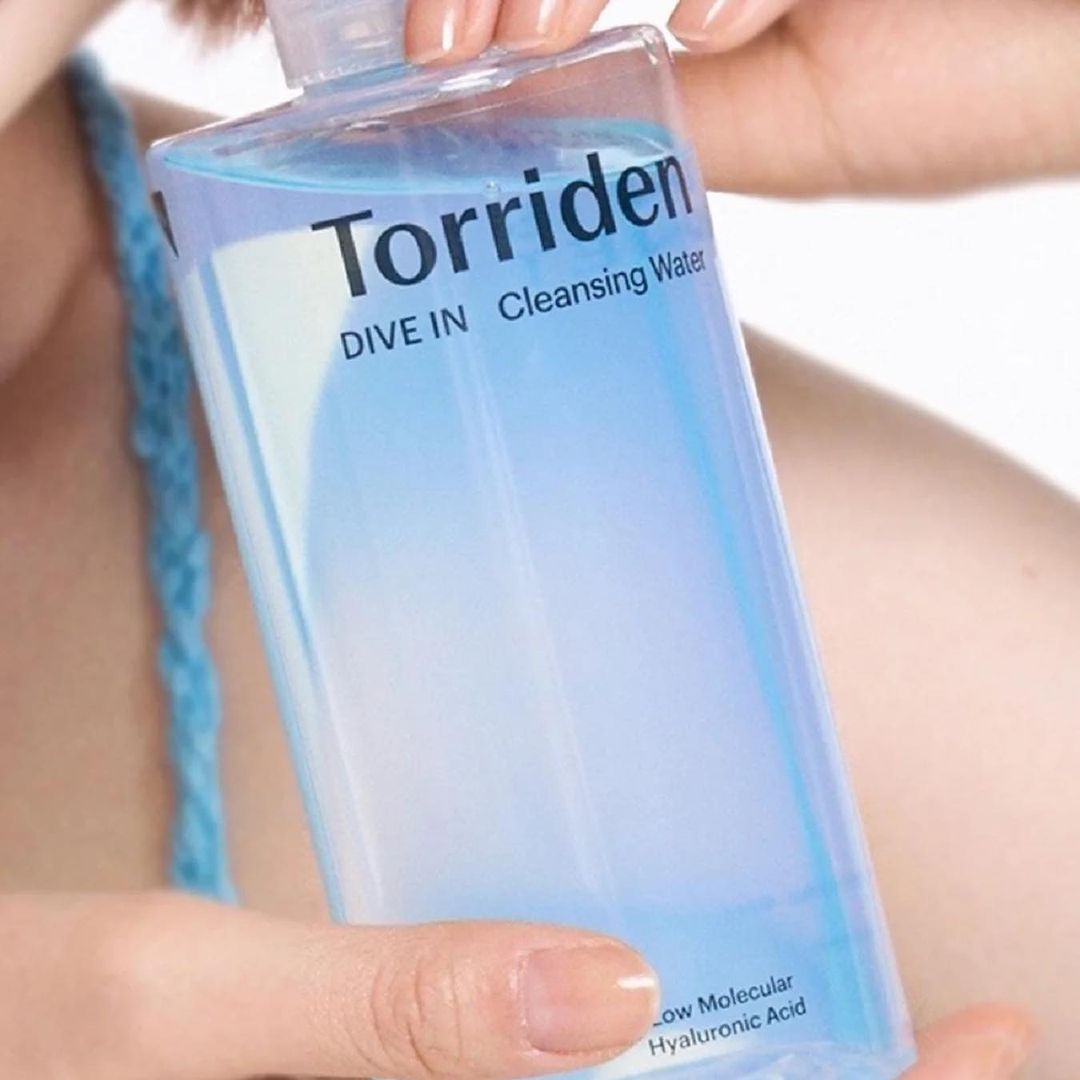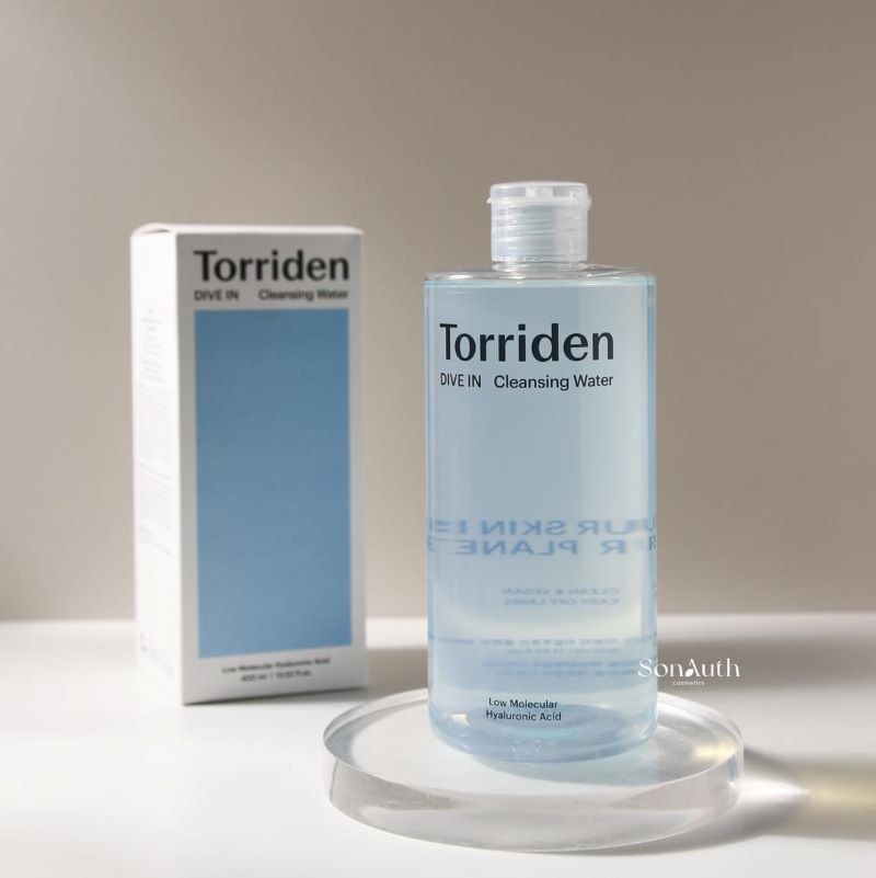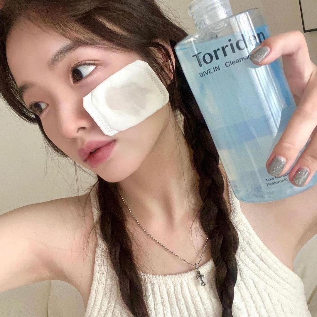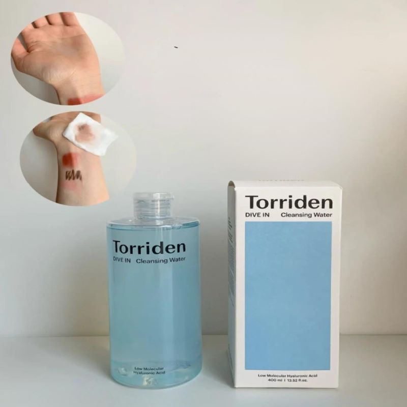 - Tẩy trang dịu nhẹ Torriden Dive-In Low Molecular Hyaluronic Acid Cleansing Water chứa Hyaluronic Acid phân tử thấp giúp làm sạch sâu trong lỗ chân lông mà không mang gây căng tức cho da