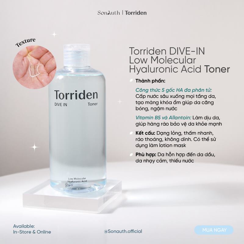 - Nước hoa hồng Torriden Dive-In Low Molecule Hyaluronic Acid Toner giúp cấp nước, phục hồi làn da đặc biệt là da dầu. Với kết cấu nhẹ và nhanh thấm, đảm bảo da bạn ngậm nước và tươi sáng ngay từ bước đầu tiên chăm sóc da.