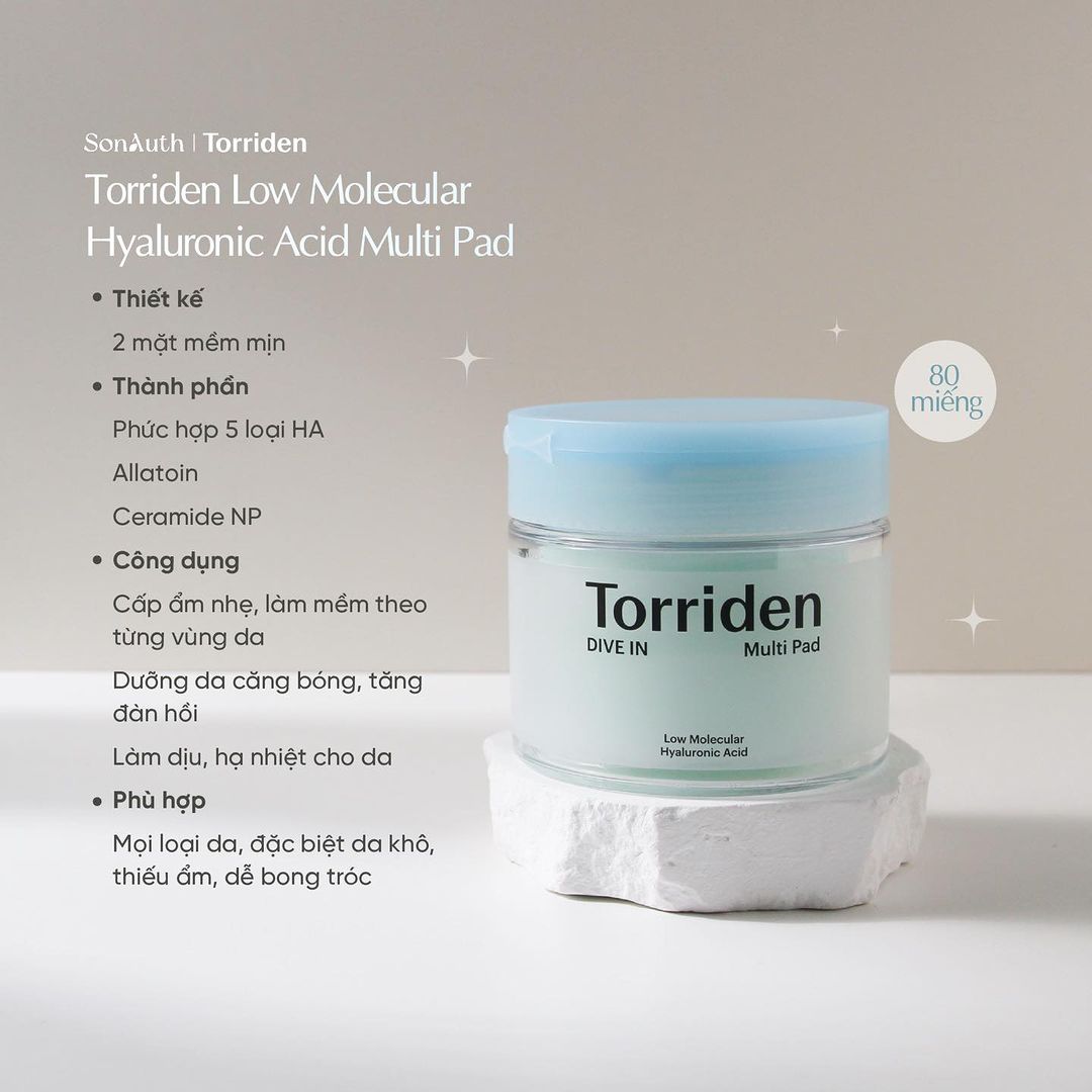 - Torriden Low Molecular Hyaluronic Acid Multi Pad có chứa thành phần nổi bật của dòng Low Molecular với Phức hợp 5 loại Hyaluronic Acid, kích cỡ khác nhau thấm sâu vào các tầng da, mang tới hiệu quả cấp ẩm sâu, dưỡng da căng bóng, tăng đàn hồi sau mỗi lần sử dụng