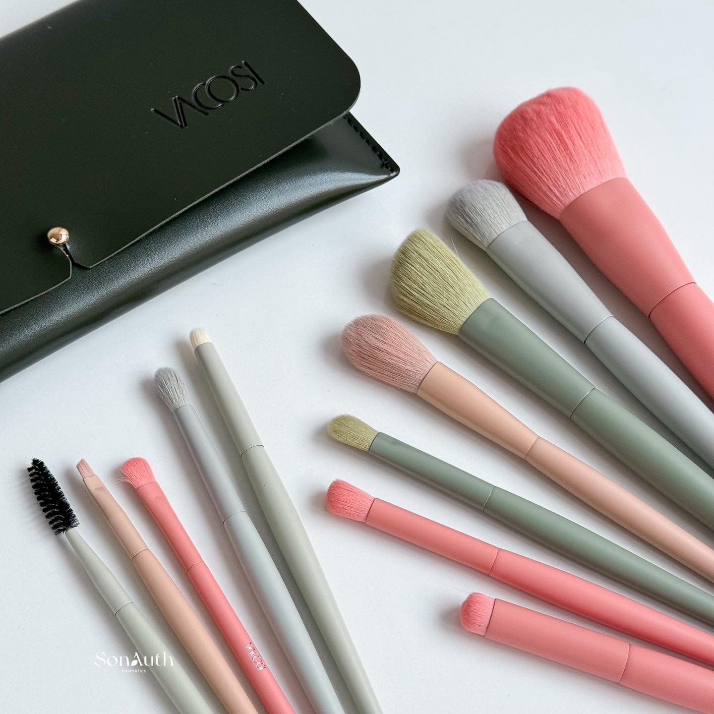 Bộ cọ 12 cây VACOSI CENTRE-PIECE có chất lượng cọ cao đặc biệt đi kèm túi da đựng màu xanh rêu, giúp bảo vệ cọ và tiện lợi mang theo đi du lịch đi chơi luôn
