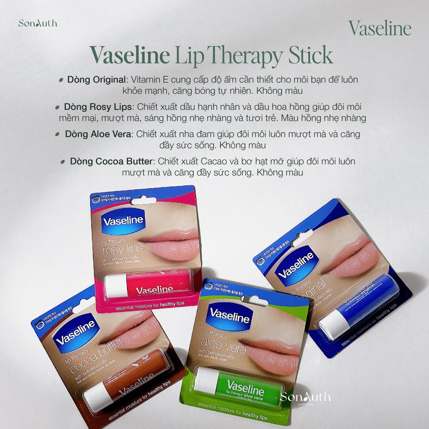 - Son dưỡng môi Vaseline Mềm Mịn với thành phần Petroleum jelly cùng Vitamin E giúp cung cấp cho môi của bạn độ ẩm cần thiết để luôn khỏe mạnh, căng bóng tự nhiên.